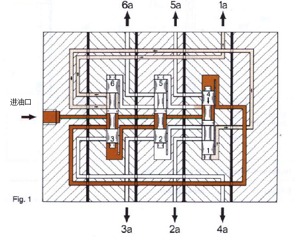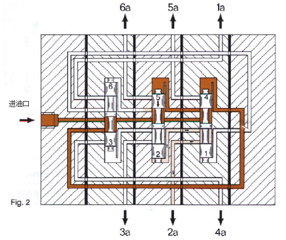 從以上的工作原理可以看出,分配器內活塞的運動過程是循序的、遞進的,即活塞動作一個接著一個,只要前面的活塞未完成動作,后面的活塞就無法動作,就會導致分配器的動作循環的終止。